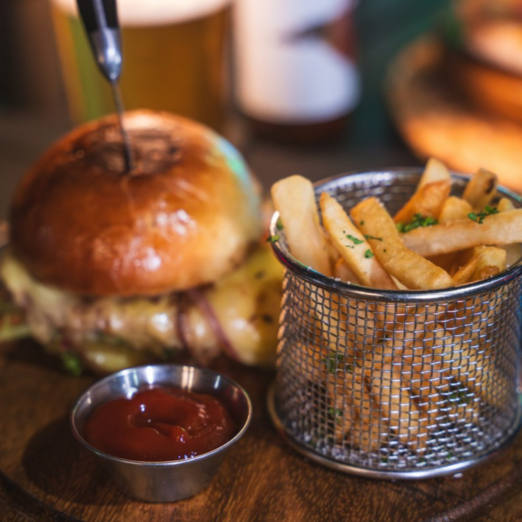 Pan tipo brioche, cebolla caramelizada, aioli de hierbas, queso manchego y papas fritas."