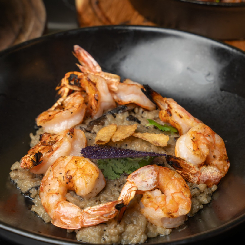 Mascarpone, queso parmesano, champiñones salteados, camarones salteados con paprika y cebolla morada."