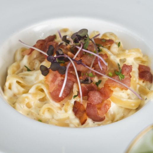 Fettucini con salsa queso, tocino crujiente y aceite de trufa.