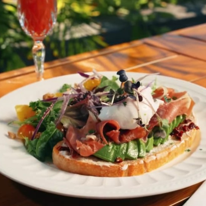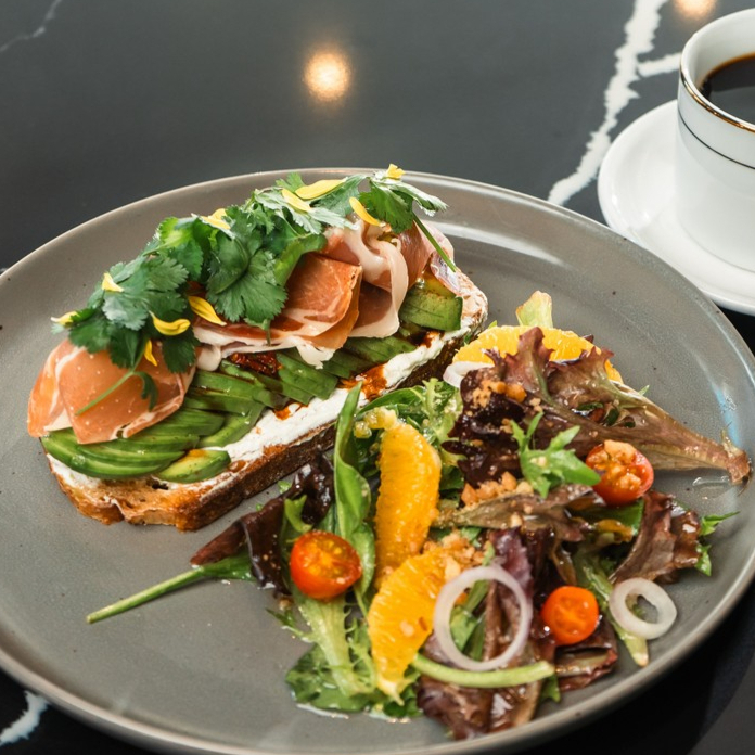 Pan de masa madre, aguacate, tomate deshidratado, huevo (1) o prosciutto con guarnición de ensalada o papa rostizada.