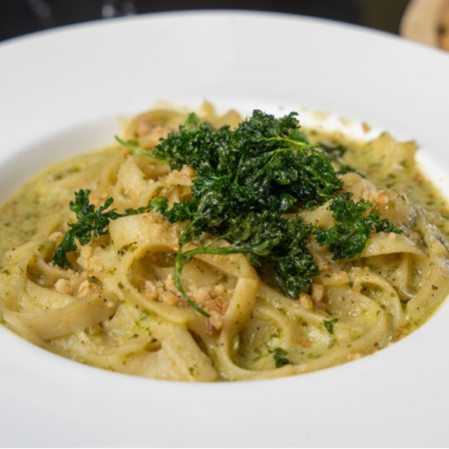 Fettucini con pesto, parmesano y nuez caramelizada."