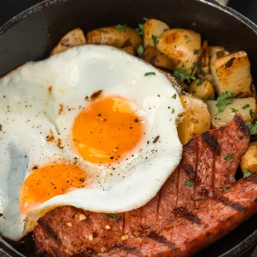 Huevos (2), queso de cabra, salchicha Argentina, y papas rostizadas.