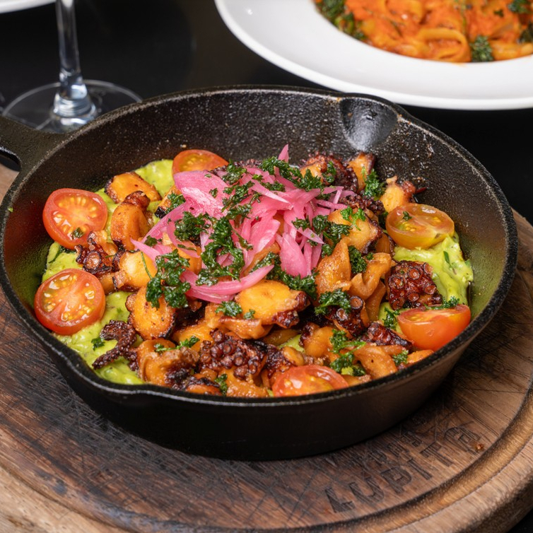 Pulpo (350 gr.) en sartén de hierro con alcaparras , limón amarillo y romero. Acompañado de tortillas de maíz y guacamole casero."