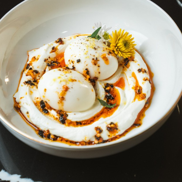 Jocoque, huevos estilo Mollet acompañado de salsa macha y pan campesino.