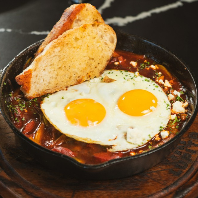 Huevos (2), verdura, salsa de chiles secos (guajillo y Ancho), queso feta acompañado de pan campesino.