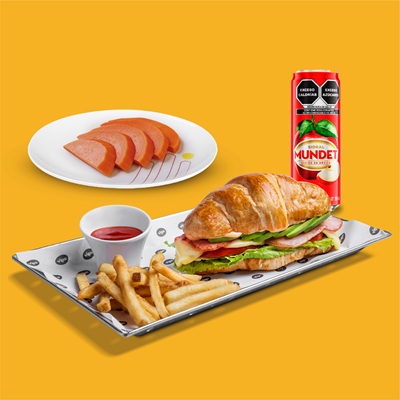 Pan especial, con jamón, pollo, queso americano, tocino, jitomate, aguacate y lechuga; acompañado de papas a la francesa.