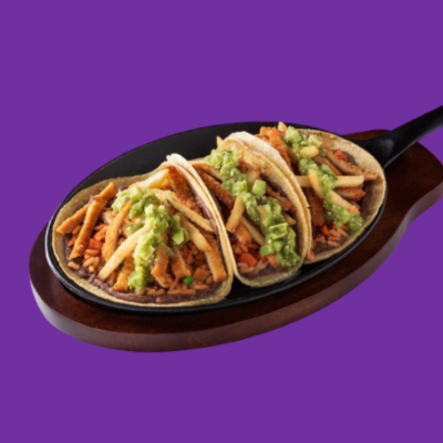 3 Tacos de pescado rebozado, preparados con aderezo de salsa macha y servidos con ensalada de col morada.