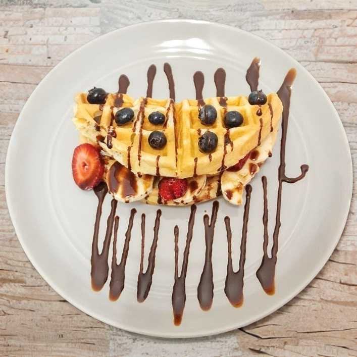 Un Waffle Regular, Doblado por la mitad, relleno y decorado con 5 ingredientes de tu eleccion a un peso. No es suficiente? Elige la porcion extra que mas te agrade.