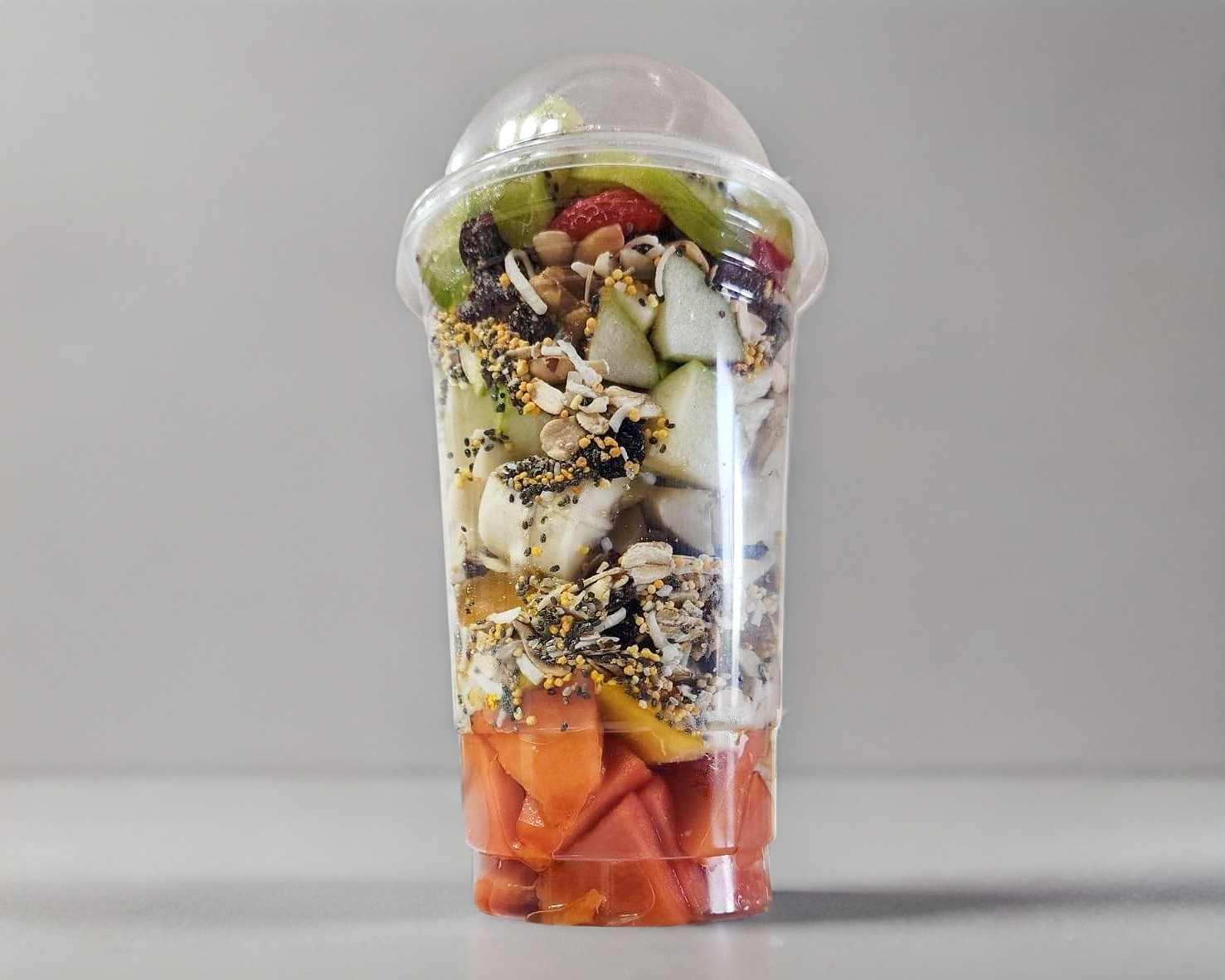 Delicioso vaso con coctel de frutas frescas de temporada (segun disponibilidad) con opcion para agregar frutos secos. (contiene alérgenos)