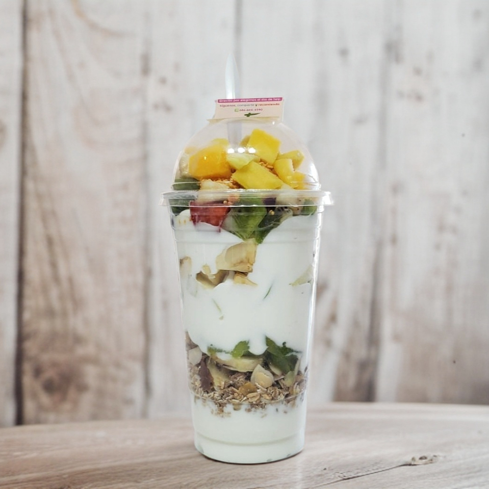 Delicioso Yogurt Griego preparado con Fruta fresca y frutos secos. (contiene alergenos)