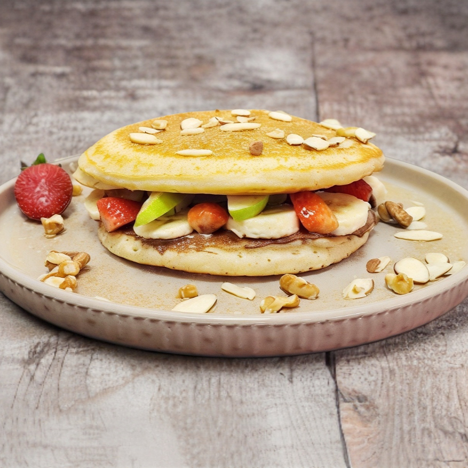 Sandwich de pancake, relleno y decorado con 5 ingredientes de tu eleccion a un peso C/U. No es suficiente? Elige la porcion extra que mas te agrade.
