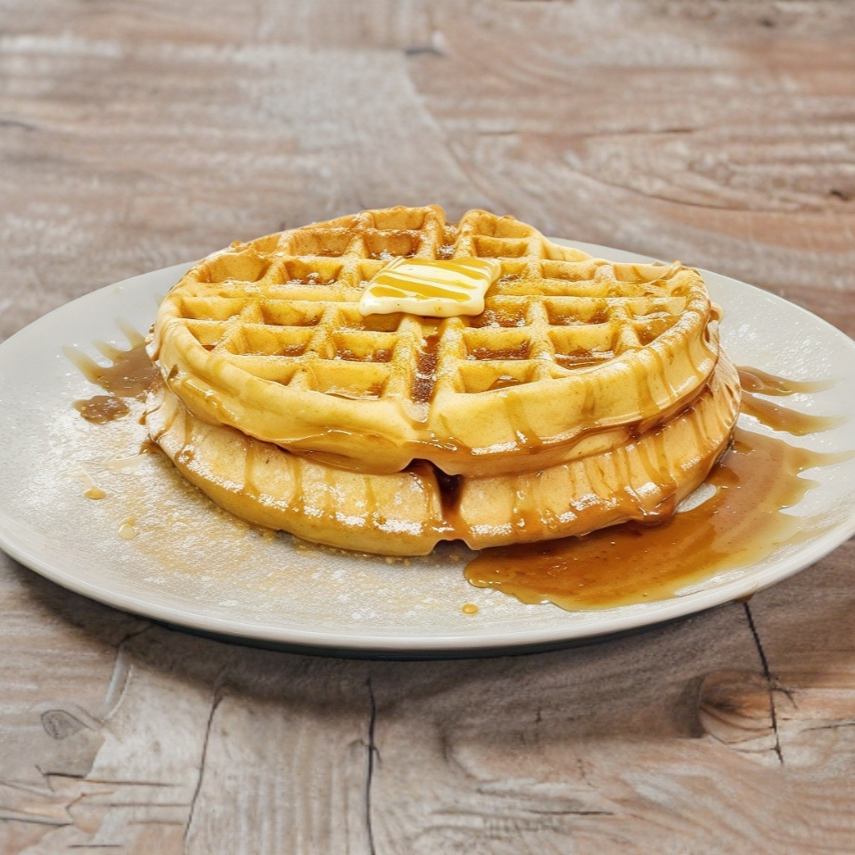 2 Waffles Americanos sencillos, incluyen: Mantequilla, Miel de maple y decoracion a elegir. Agrega el extra que mas te agrade.
