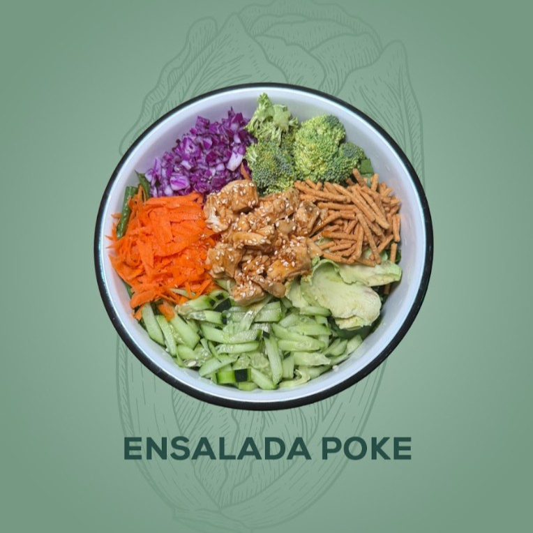 Pollo teriyaki, fideos orientales, zanahoria, col, brócoli, pepino, aguacate, ajonjolí, salsa ponzu y mayonesa chipotle.