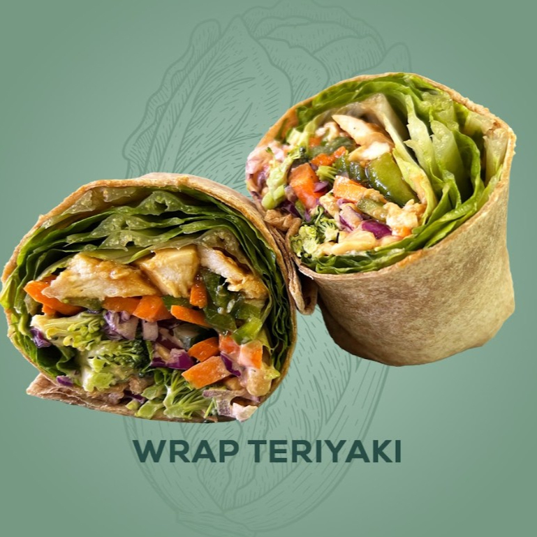 Pollo teriyaki, brócoli, zanahoria, col morada, cebolla morada, cacahuates, lechuga y mayonesa chipotle.