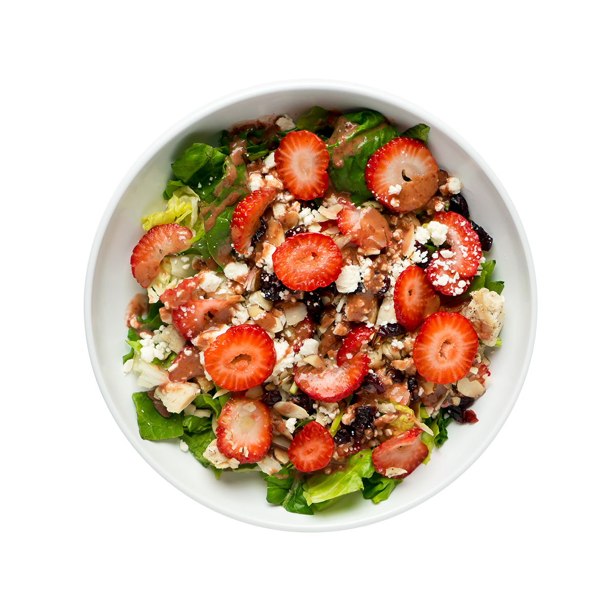 Pollo, queso feta, almendras, arándanos, fresas, espinacas, lechuga y vinagreta de fresa.