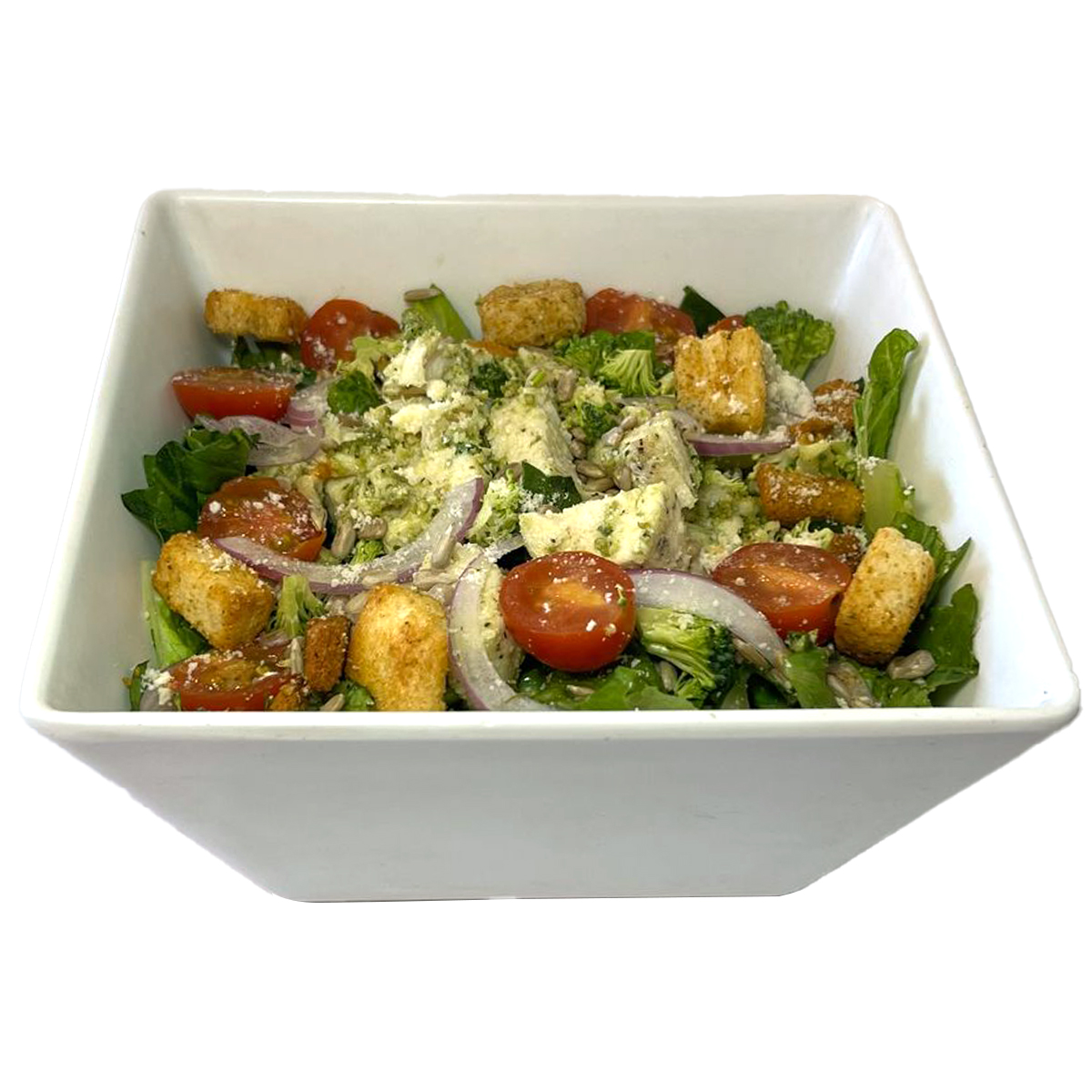 Pollo pesto, parmesano, crutones, semillas de girasol, tomate cherry, cebolla morada, brócoli y aderezo césar.