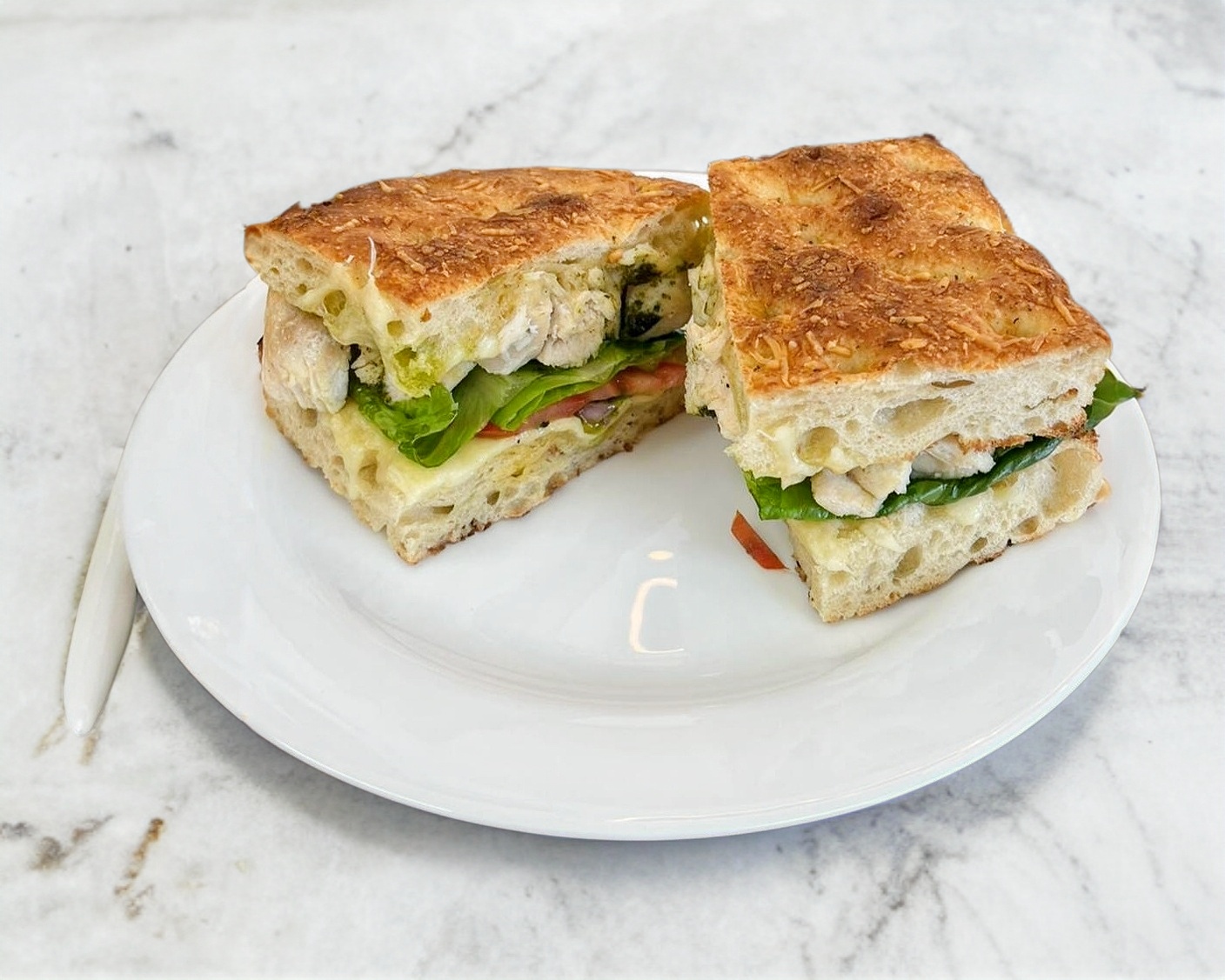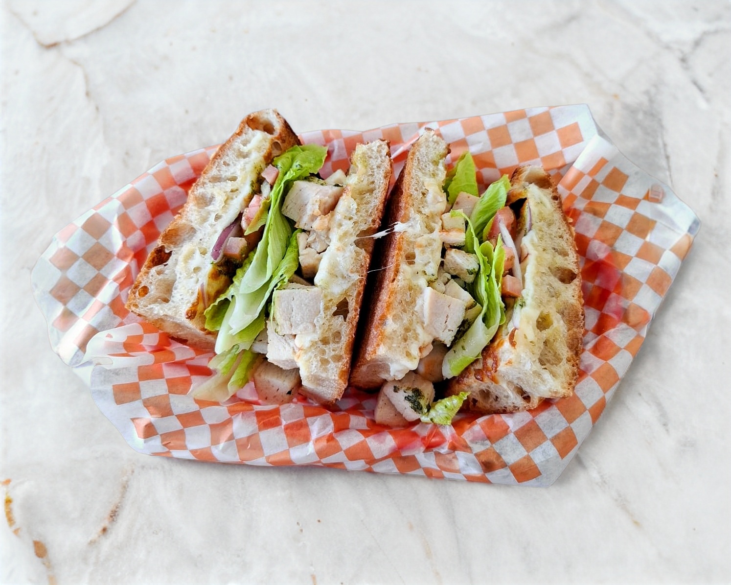 Pan artesanal, 100g de Pechuga de pollo Salsa pesto, Mezcla de quesos, Lechuga romana, Tomate y Cebolla morada. Porcion personal.