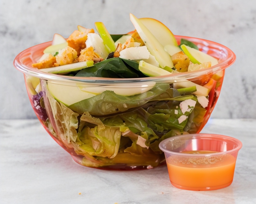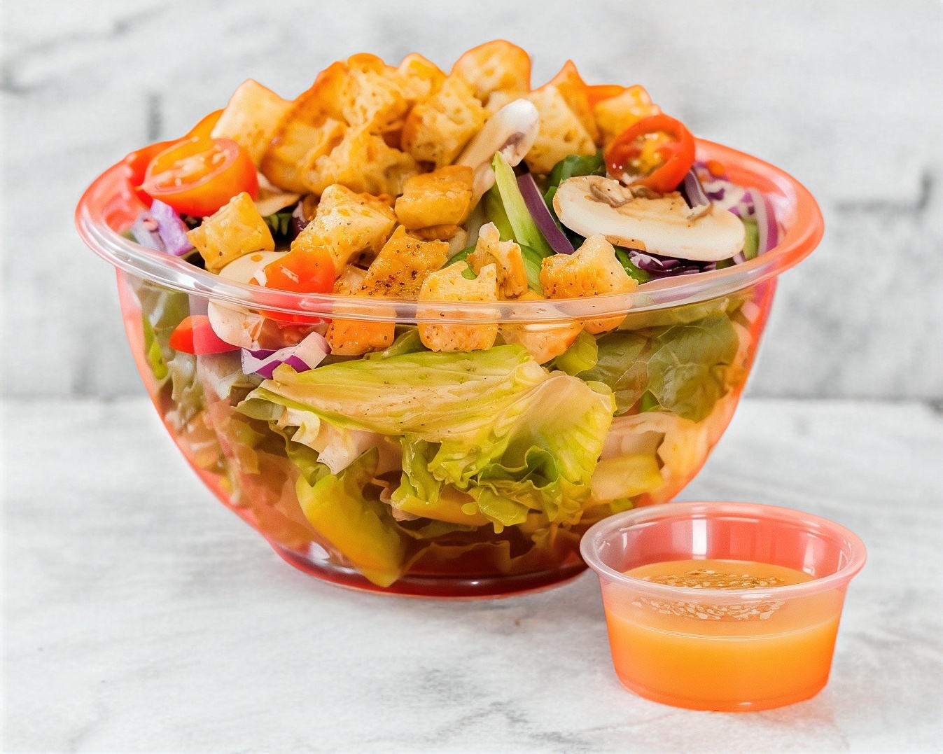 Lechuga romana, Espinaca, Tomate cherry, Pepino persa, Cebolla morada, champiñones, Pimiento morron, Croutons y Aderezo de vinagreta dulce. Porcion personal