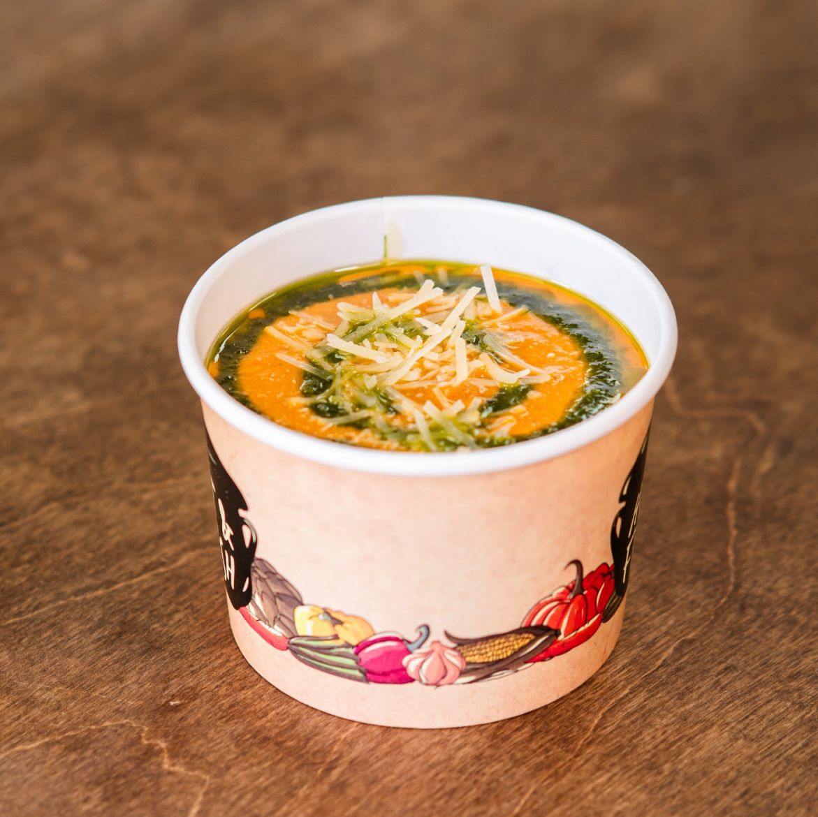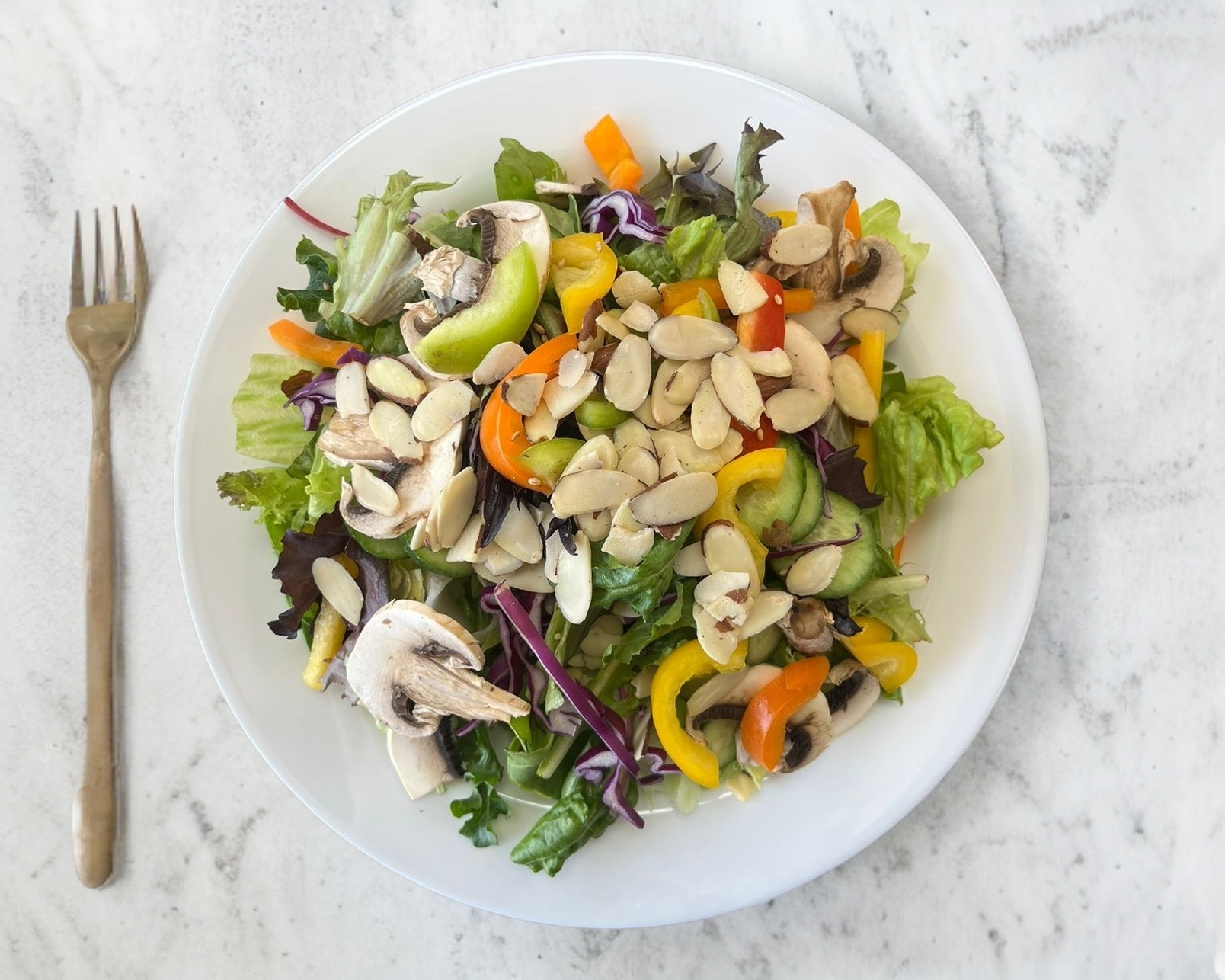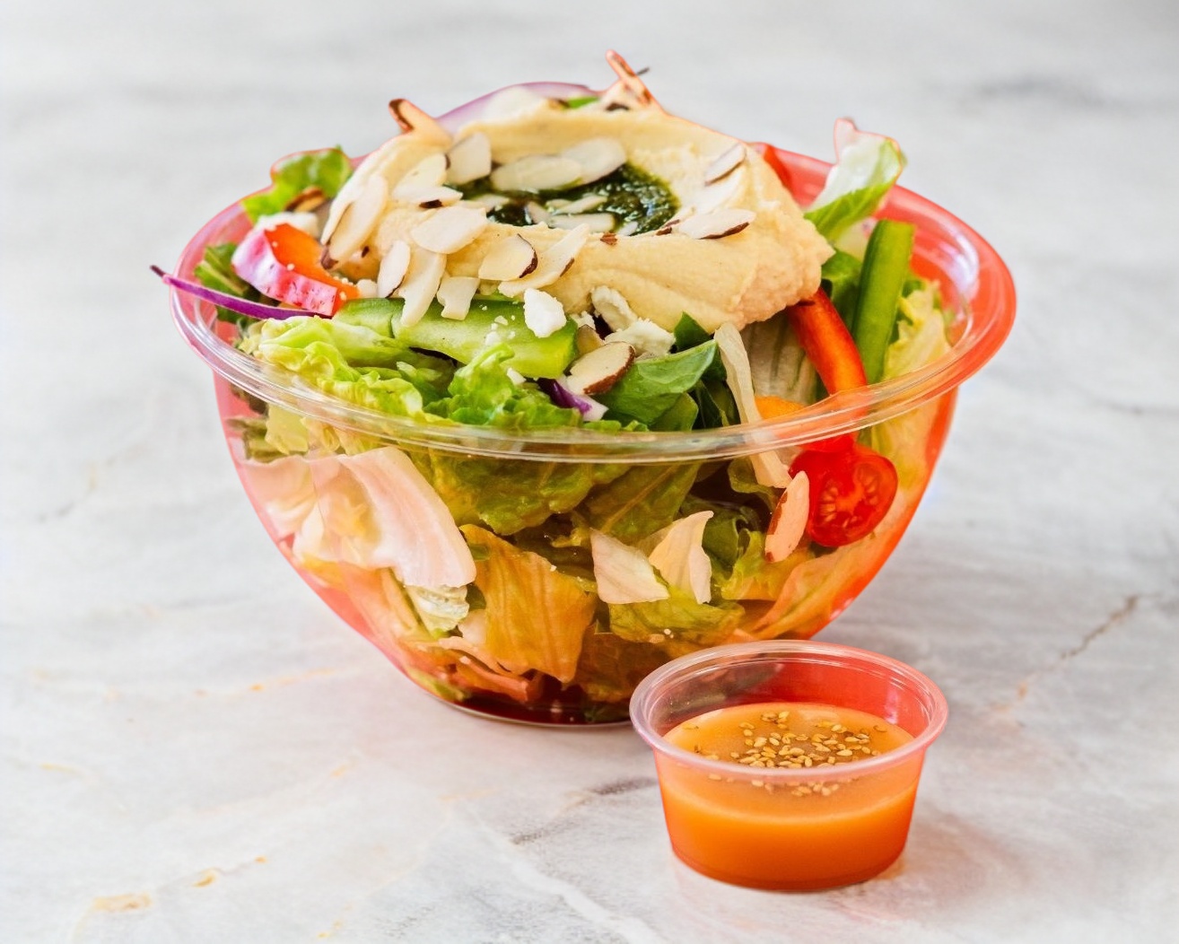 Lechuga Romana, Tomate Cherry, Pepino Persa, Cebolla Morada, Croutons, Pimiento Morron, Queso Feta, Humus, Pesto, Almendras y Aderezo de Vinagreta Dulce. Porcion personal