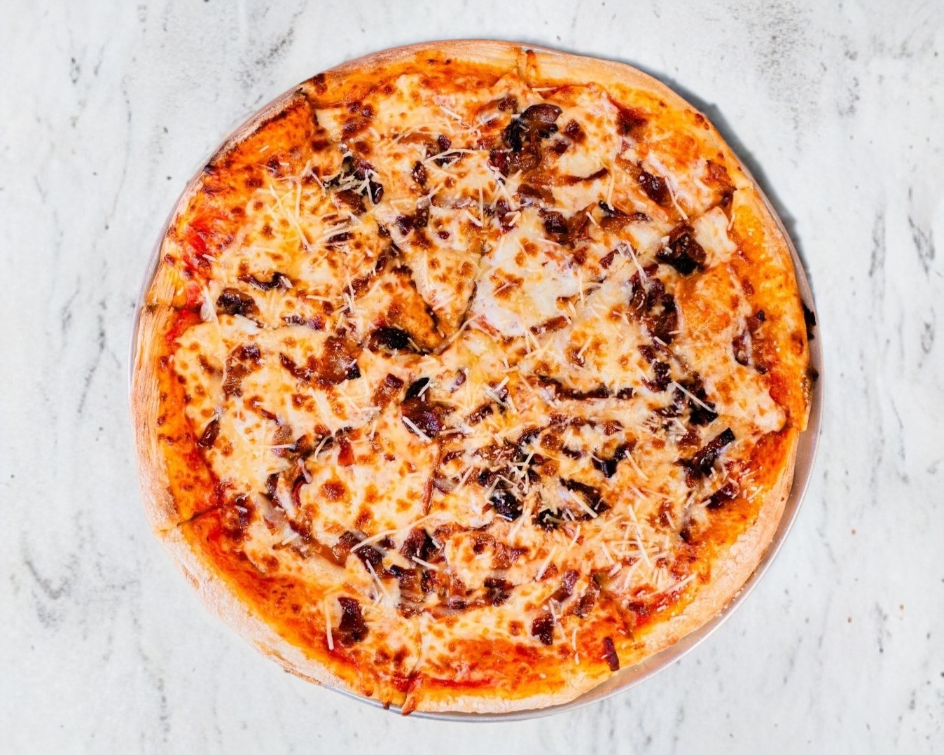 Salsa Pomodoro, Queso mozzarella, Tocino de cerdo, Aderezo de Ajo con Mantequilla y Queso Parmesano.