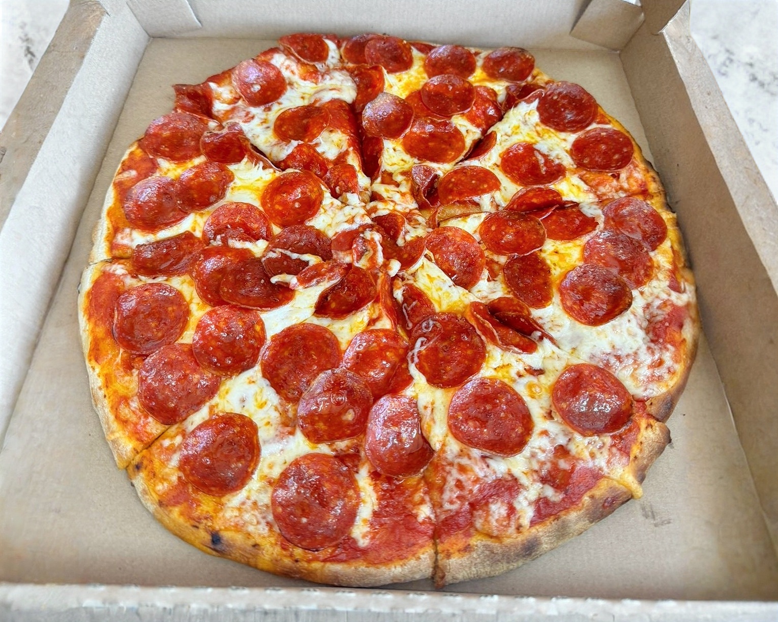 Salsa Pomodoro, Mezcla de quesos, Mucho Pepperoni y Queso Parmesano.