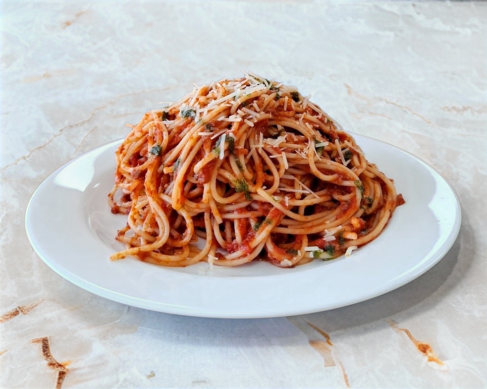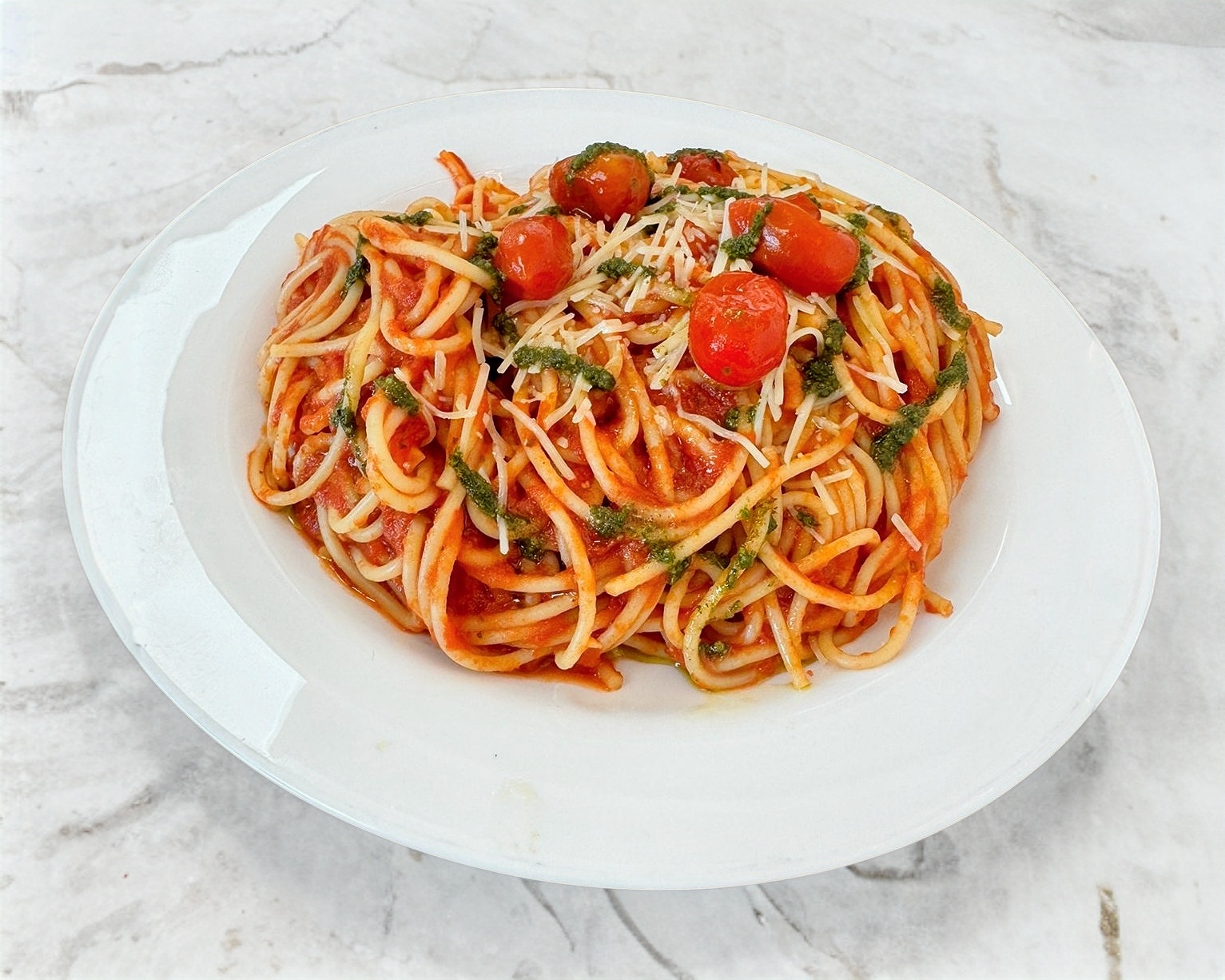 Spagetti, Salsa pomodoro, Pesto y Queso parmesano.
