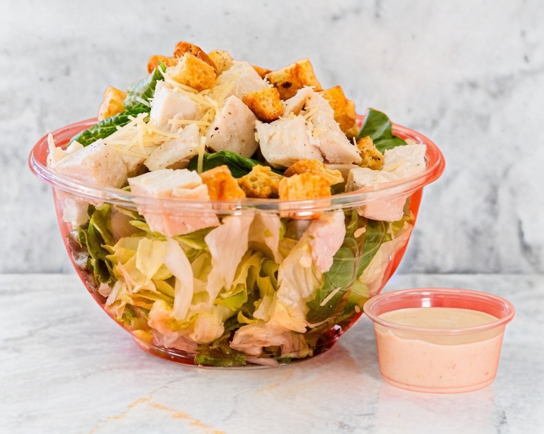 Lechuga romana, 100g de pollo a la plancha, Queso parmesano, Croutons y Aderezo César. Porcion personal
