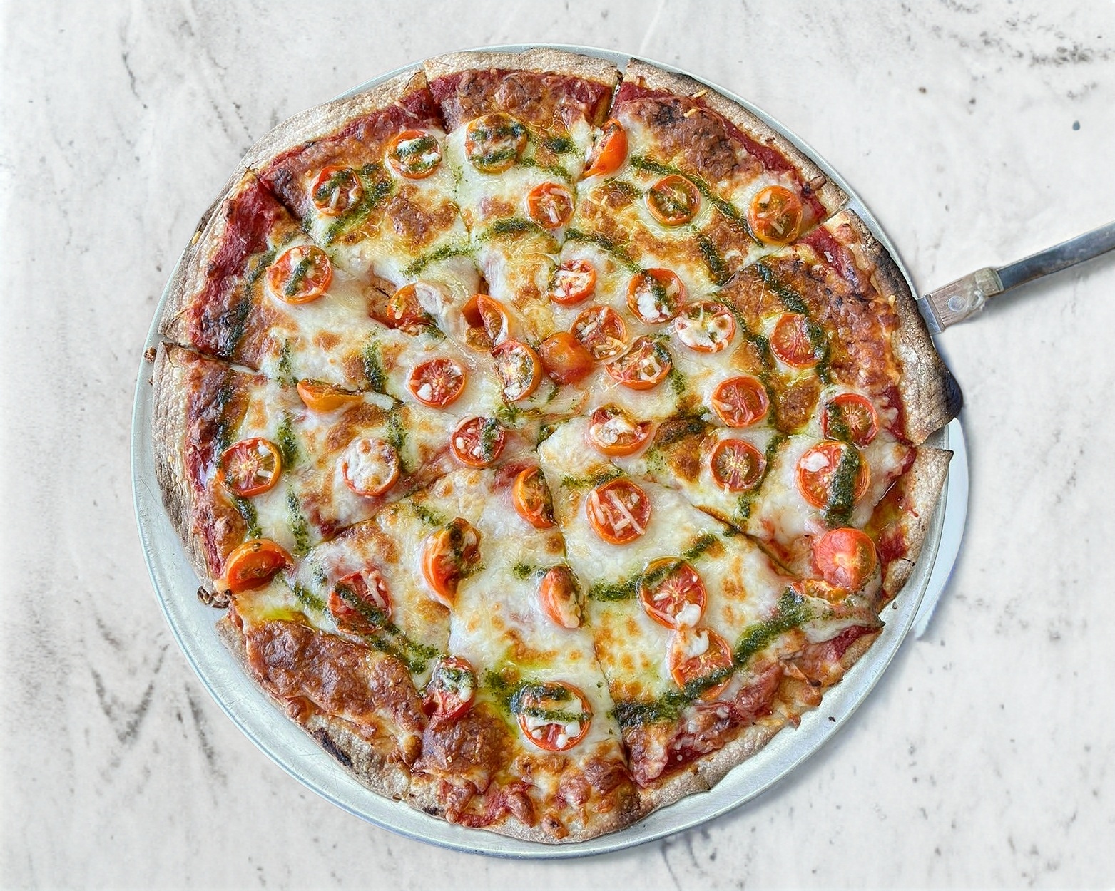 Salsa Pomodoro, Mezcla de Quesos, Tomate cherry, Albahaca, Pesto y Queso Parmesano.