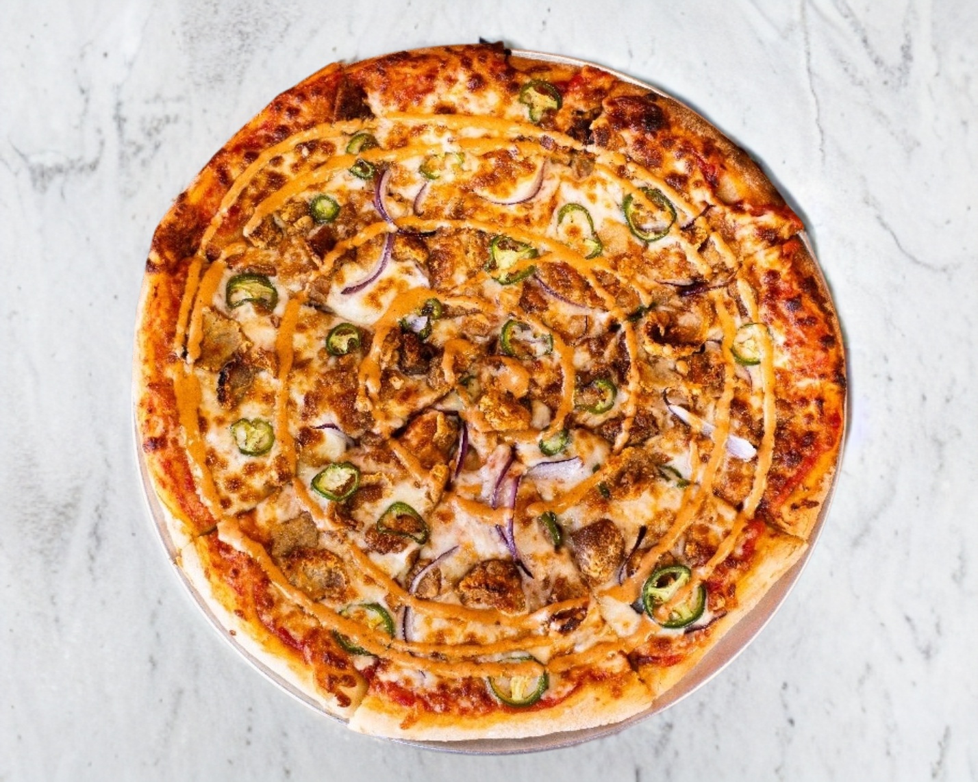 Queso Mozarella, Chicharrón de Cerdo, Cebolla Morada, Chile Jalapeño y Aderezo Chilpotle.