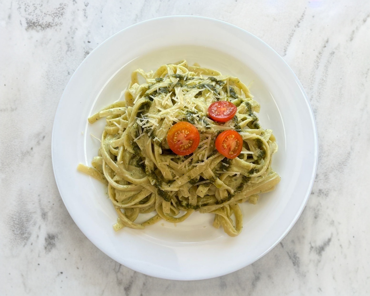 Pasta Fettuccine, Crema especial, Salsa pesto, Queso Parmesano.