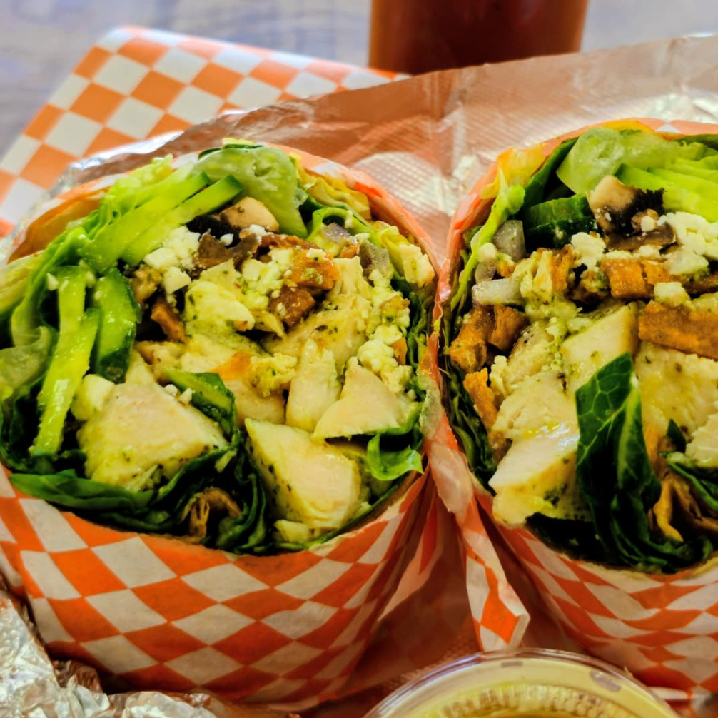 Tortilla de chipotle, 90gr de pechuga de pollo, pepino persa, cebolla, champiñones, queso feta, tortilla chips, aderezo cítrico y pesto