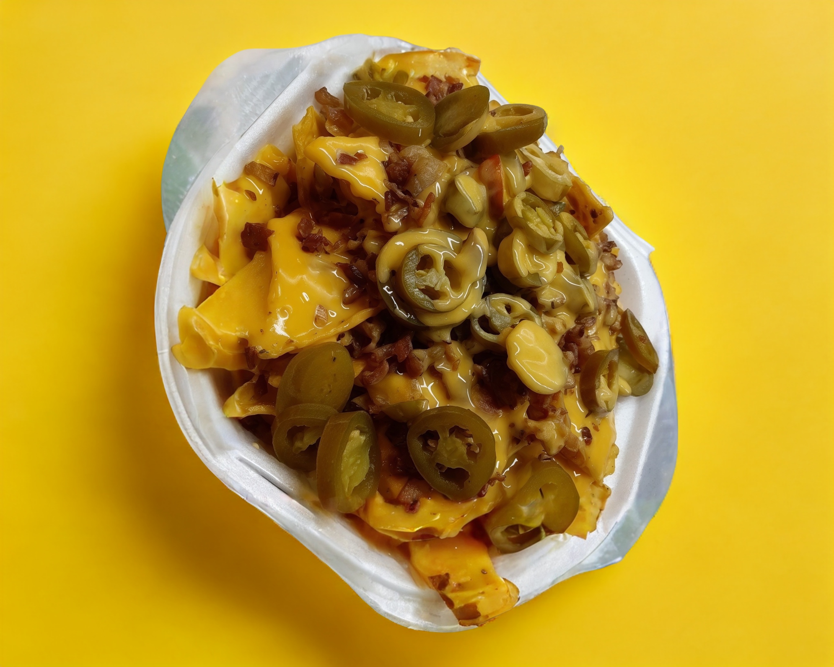 Totopo, queso nacho, tocino y jalapeños.