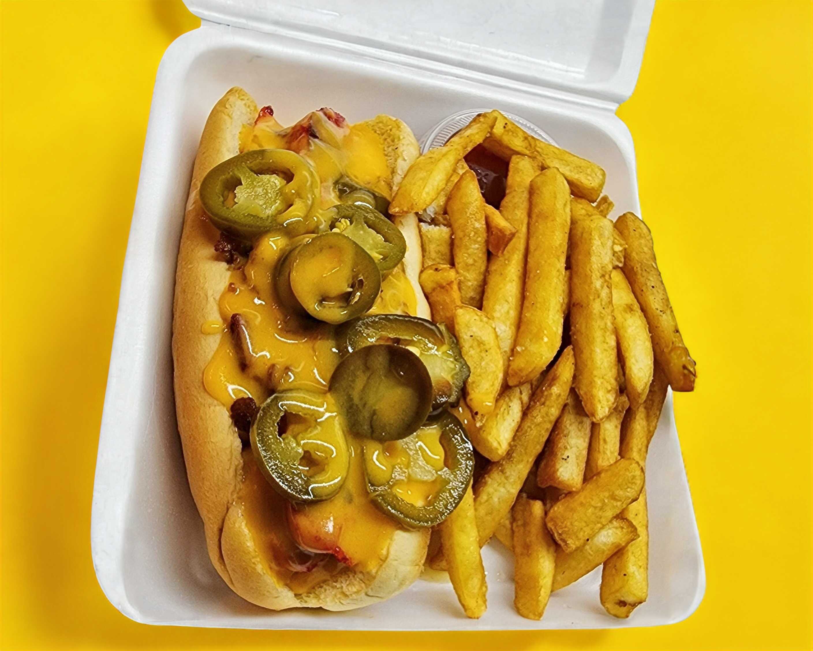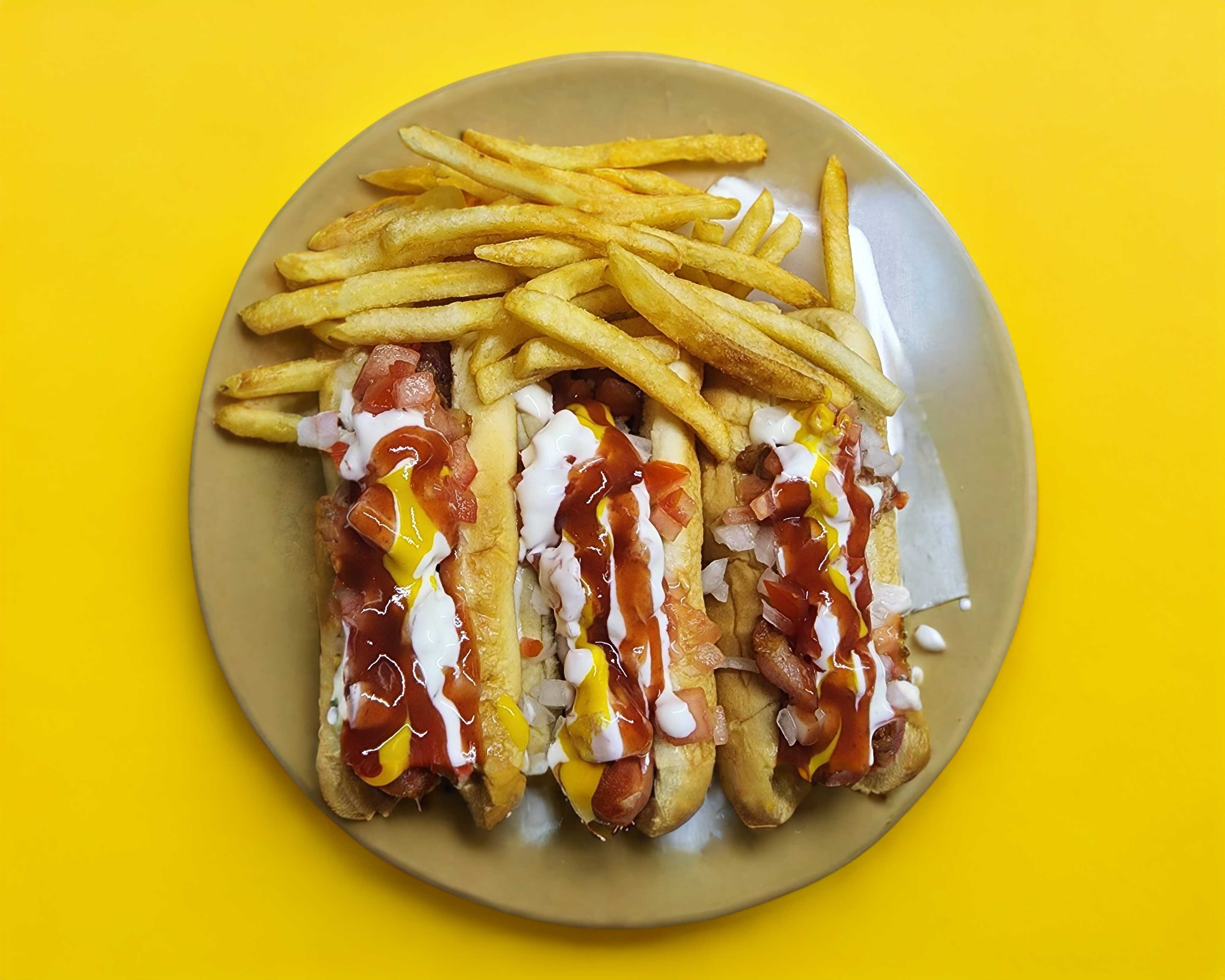 Salchicha de pavo, tocino,tomate,cebolla,mayonesa,capsu,mostaza,porción de papas fritas