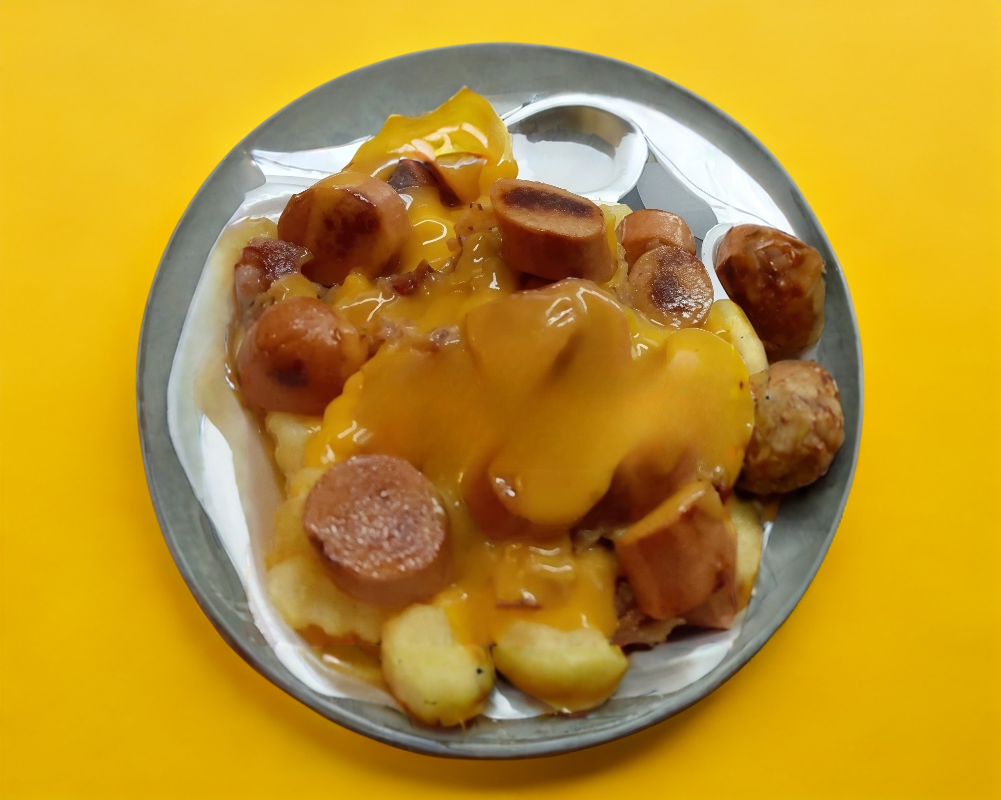 • Papas fritas, queso nacho, tocino y salchicha.