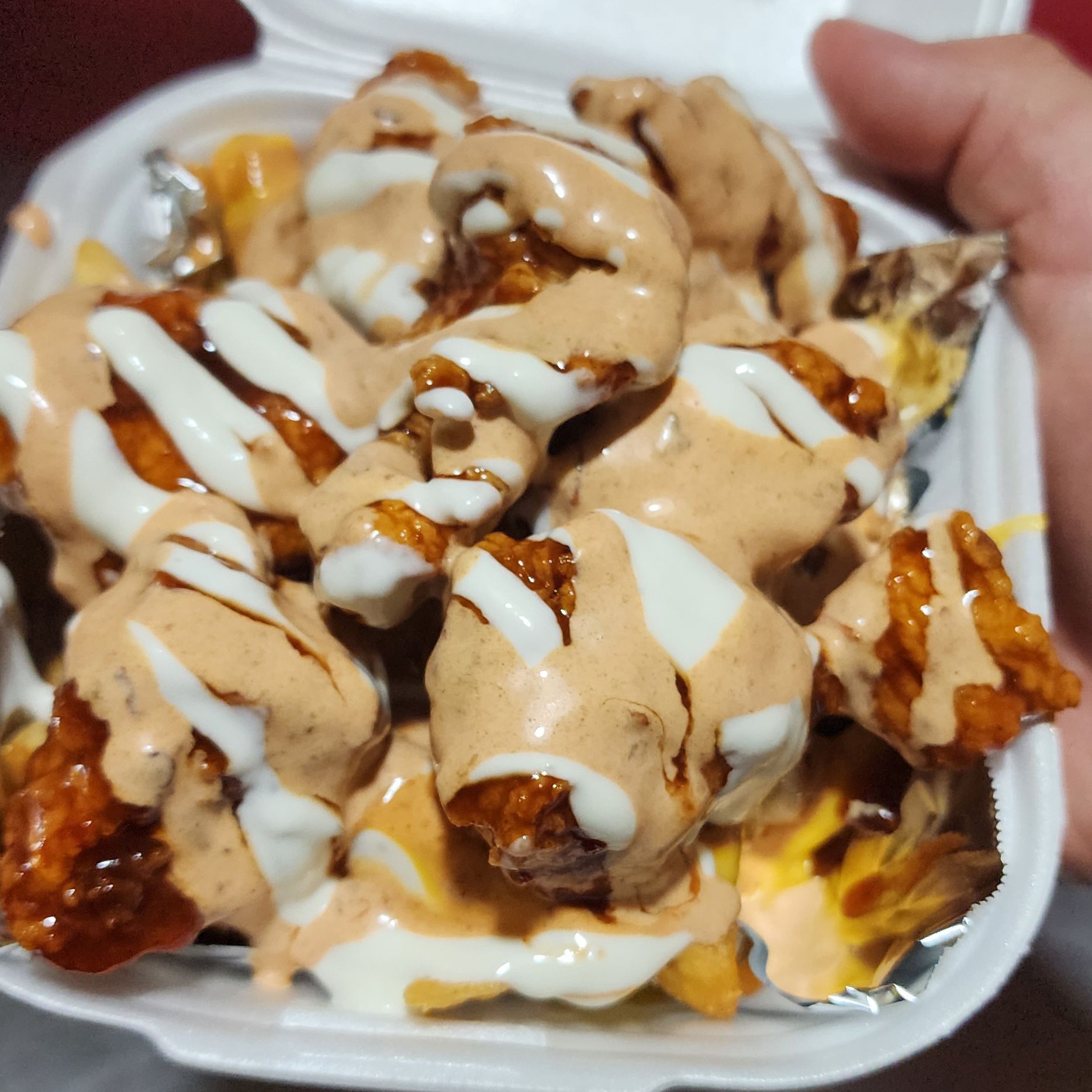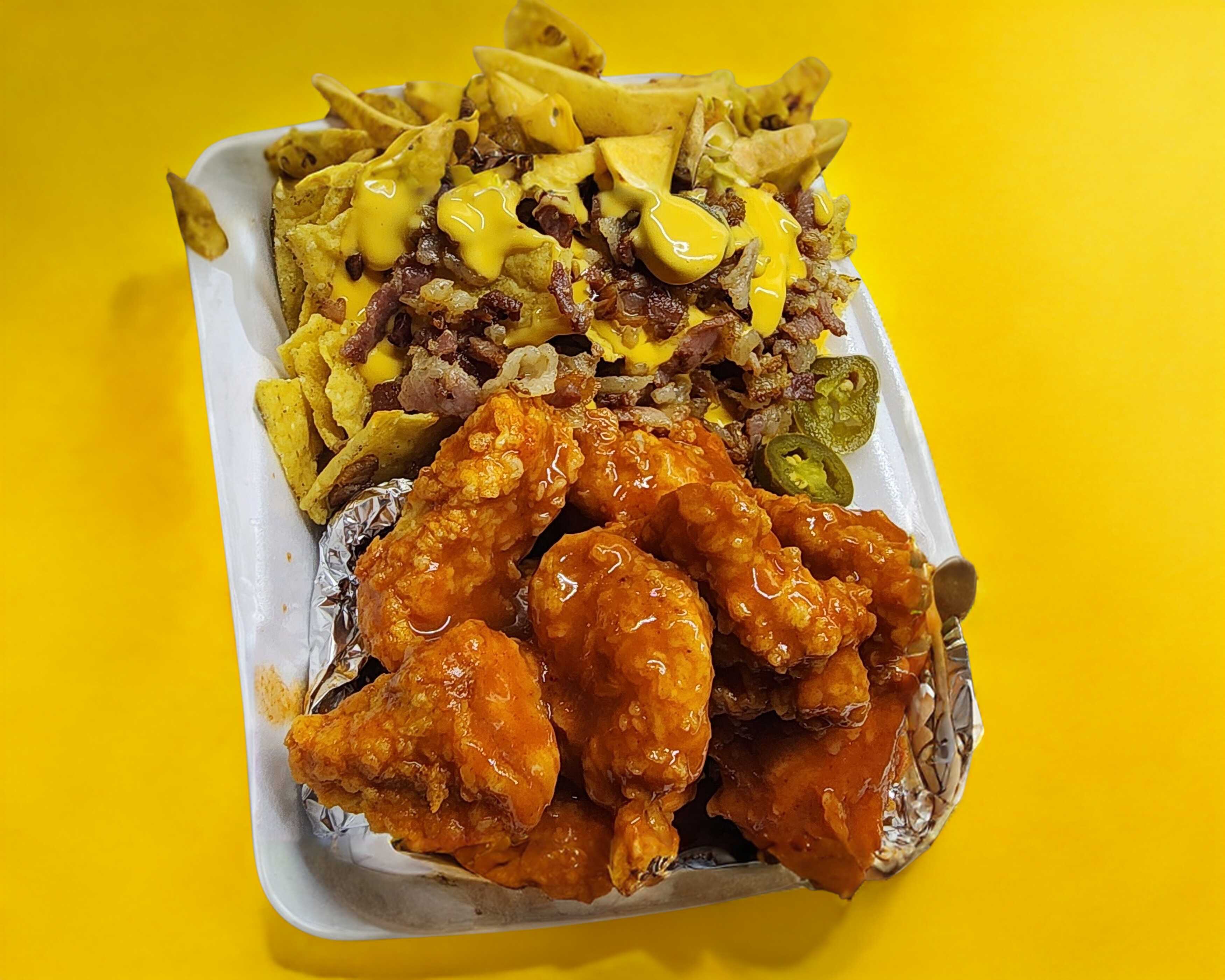 Cama de papas fritas, queso nacho, 6 piezas boneles bañados en tu salsa favorita, bañados de ranch y chipotle