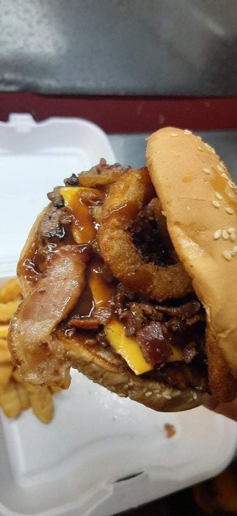 Deliciosa carne de res, queso americano, tocino,aros de cebolla, salsa bbq incluye papas fritas