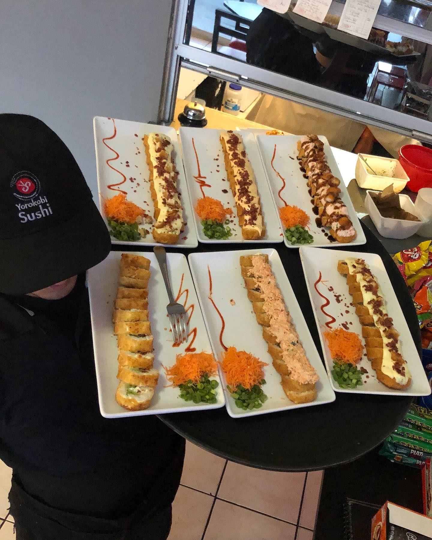 Pepino, aguacate, Philadelphia, tampico spicy, camarón empanizado adentro, por fuera forrado en Philadelphia, salmón, medallón de atún, aguacate y topping de tempura bañado en chipotle y anguila.
