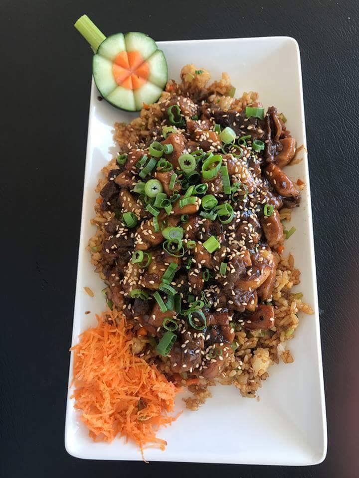 Arroz yakimeshi, tampico Philadelphia, aguacate y salsa de anguila.