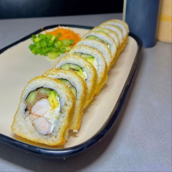 Pepino, philadelphia, aguacate, res, tocino y chile toreado por dentro, sobre el empanizado, 3 quesos y surimi.