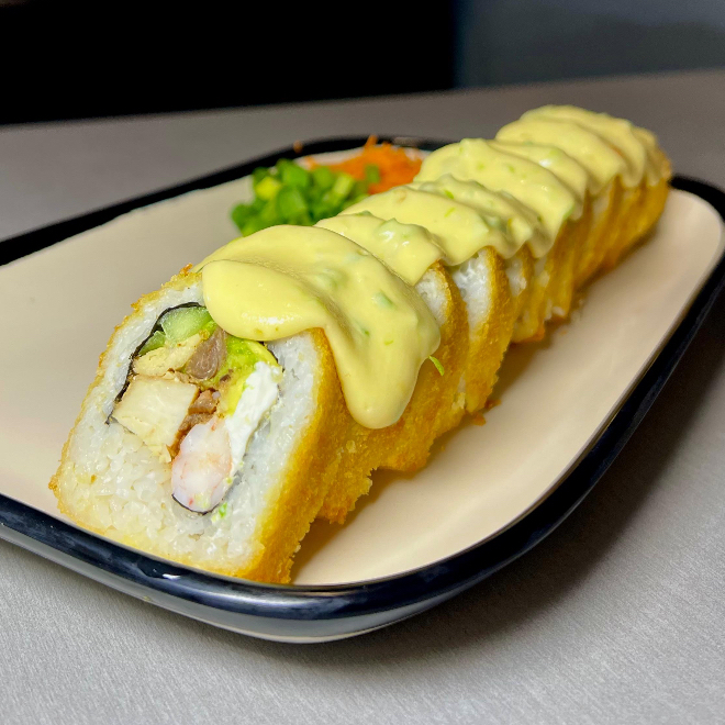 Pepino, aguacate, Philadelphia, ingrediente a escoger por dentro, por fuera gratinado de 3 quesos chipotle y lluvia de tocino.