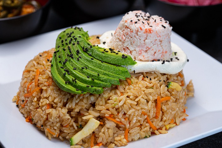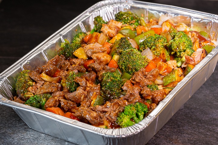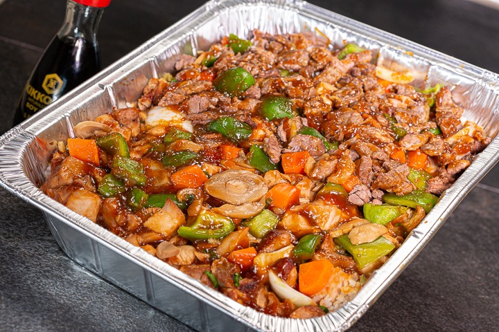 Chile morrón, champiñones, zanahoria, cebolla y ajonjolí mezclados en la plancha con salsa teriyaki, pollo deshuesado, carne de res y camarón, servido sobre una cama de arroz y acompañado de ensalada de la casa