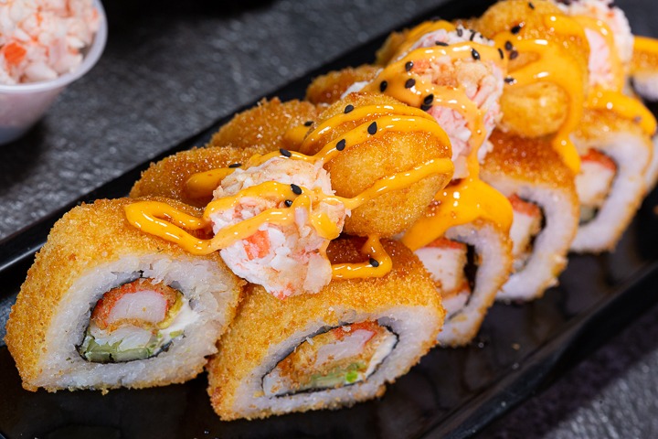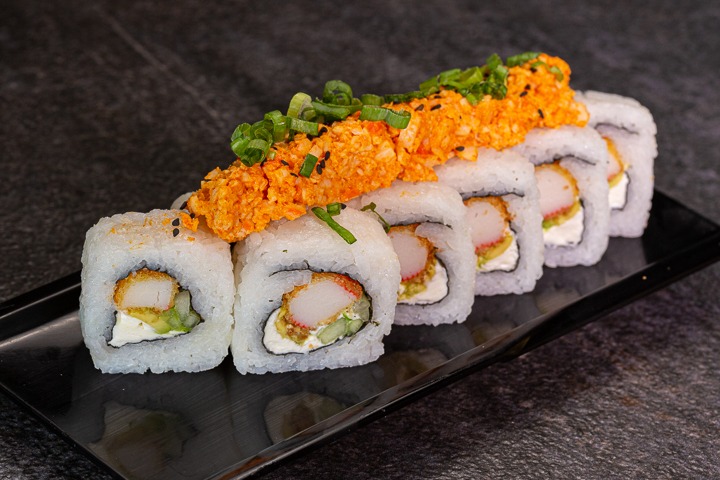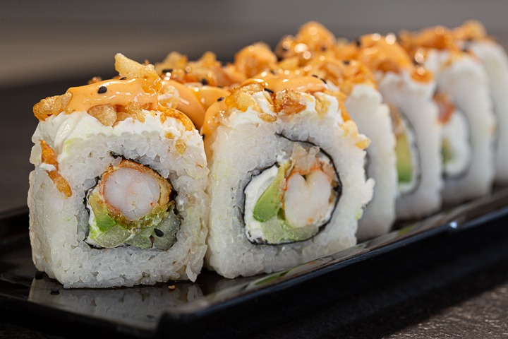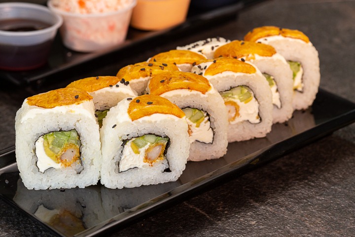Rollo natural con pollo empanizado, cubierto de hojuelas de tempura, salsa de anguila y mayonesa picante. Todos nuestros sushis llevan queso crema, aguacate y pepino; y van acompañados de Té de la casa.