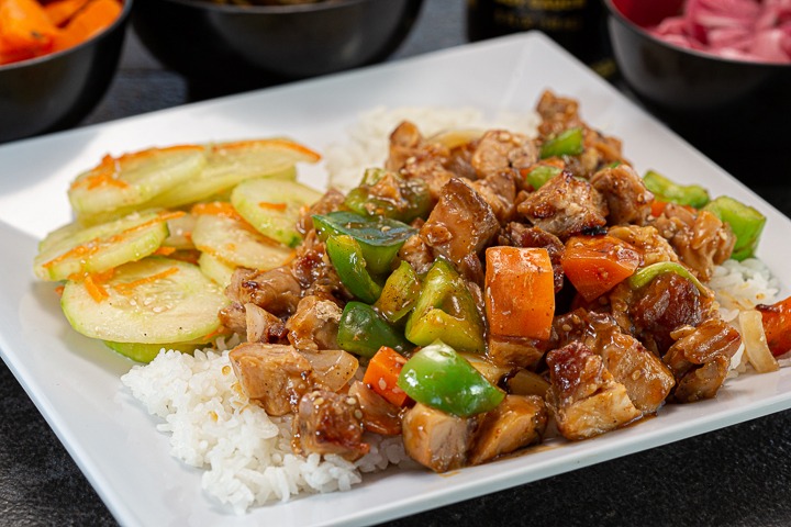 Nuestra deliciosa salsa teriyaki, se mezcla en la plancha con pollo deshuesado y carne de res, chile jalapeño, cebollín y ajonjolí, se sirve sobre una cama de arroz y se acompaña de ensalada de la casa