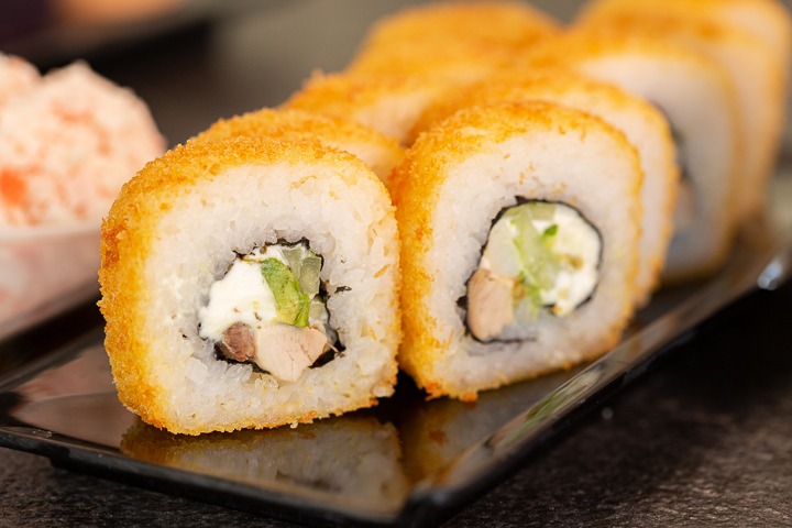 Rollo empanizado con pollo, y encima salsas teriyaki y chipotle. Todos nuestros sushis llevan queso crema, aguacate y pepino; y van acompañados de Té de la casa.