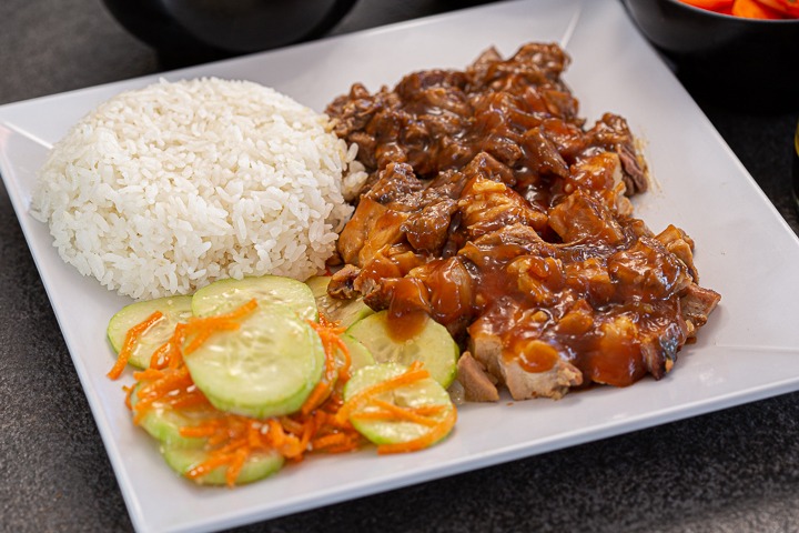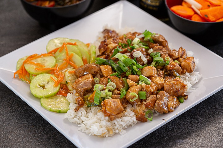 Tazón de arroz con pollo deshuesado encima y salsa teriyaki