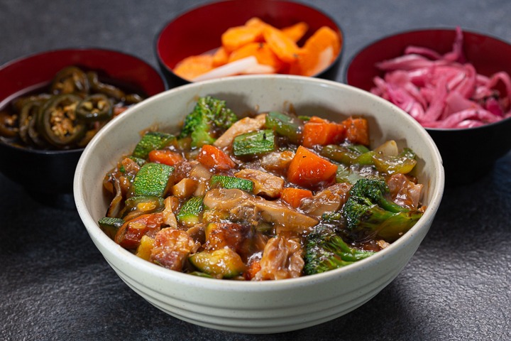 Tazón grande de arroz y encima verduras al vapor mezcladas con pollo deshuesado, carne de res y salsa teriyaki