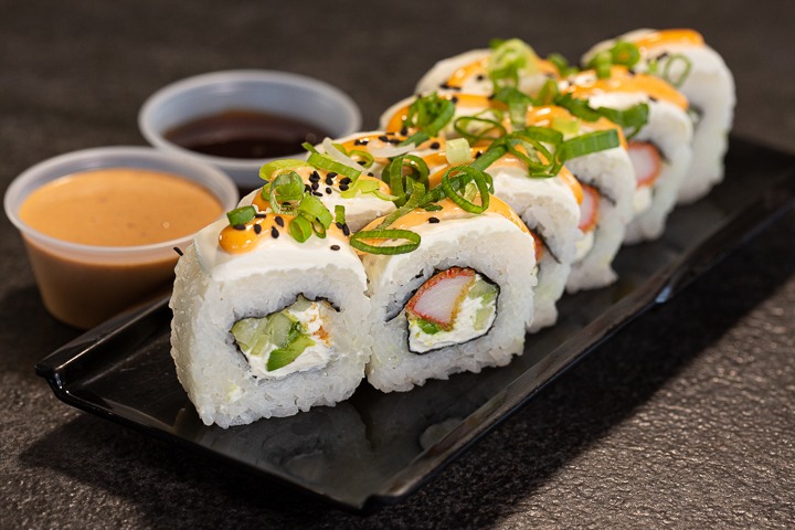 Surimi empanizado, forrado de queso crema y cubierto con mayonesa picante y cebollín