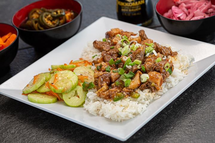 El rico tazón de arroz con el ingrediente de su antojo encima preparado a la plancha, con salsa teriyaki