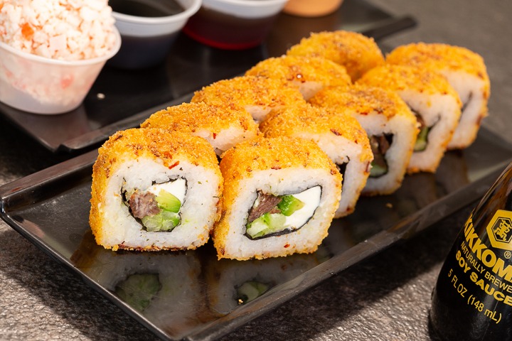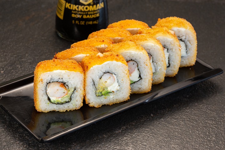 Rollo empanizado con pollo en tempura, cubierto de salsa de anguila y cebollas en tempura. Todos nuestros sushis llevan queso crema, aguacate y pepino; y van acompañados de Té de la casa.