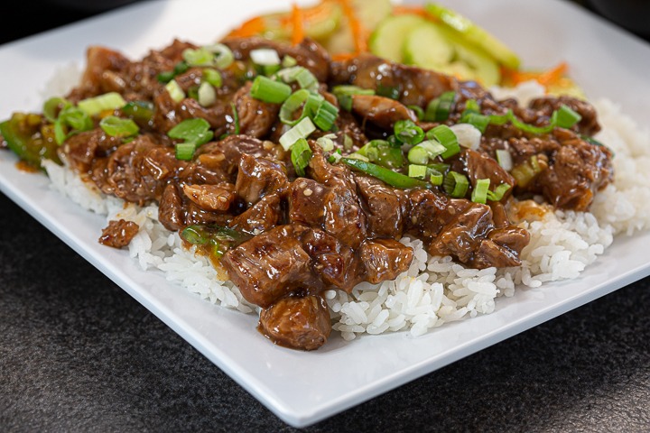 Nuestra deliciosa salsa teriyaki, se mezcla en la plancha con carne de res, chile jalapeño, cebollín y ajonjolí, se sirve sobre una cama de arroz y se acompaña de ensalada de la casa